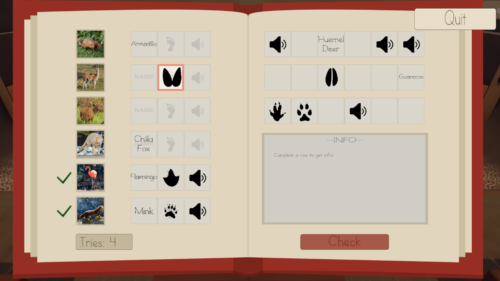 Animal Minigame: connect the name, footprint and sound of an animal with its visual.
